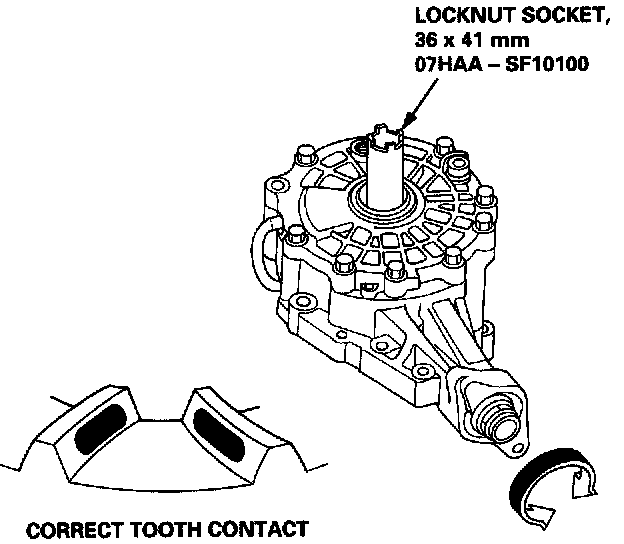13. Remove the differential case cover, and check the tooth contact pattern (heel and toe). Adjust the ring gear tooth contact as needed.
