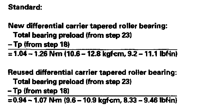 23. Remove the special tool, and use a dial-type torque wrench on the drive pinion to check total bearing preload. The total bearing preload should exceed the drive pinion bearing preload by the amount shown in the next column.
