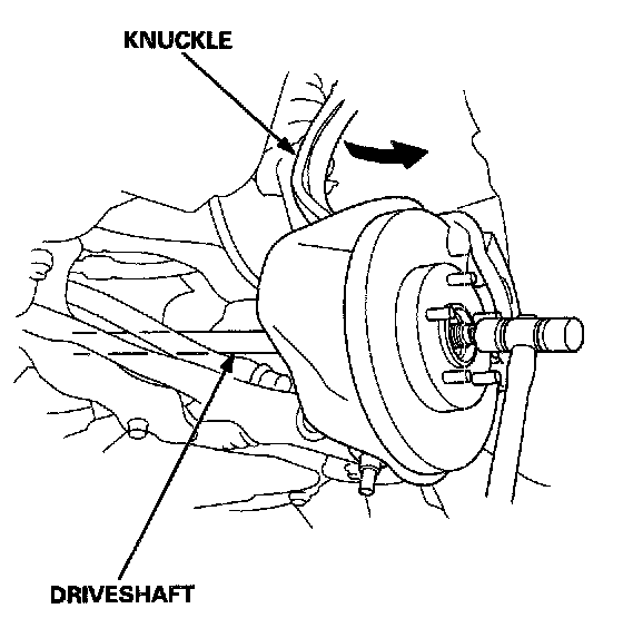 13. Pull the knuckle outward, and remove the driveshaft outboard joint from the front wheel hub using a plastic hammer.
