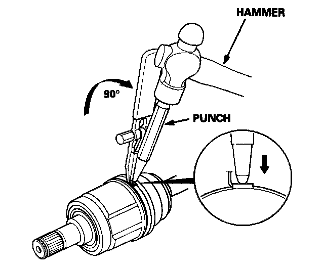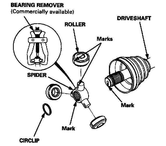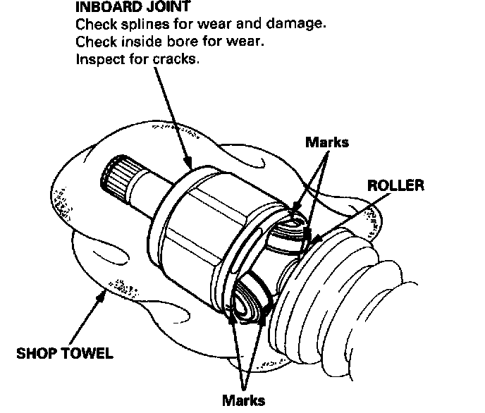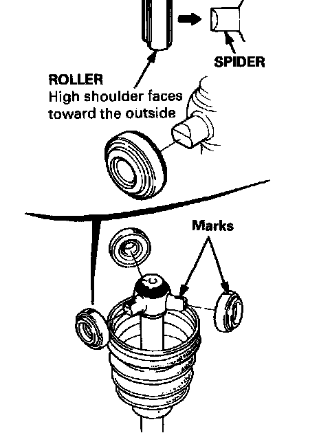 - Reinstall the inboard joint onto the driveshaft by aligning the marks on the inboard joint with the marks on the rollers.