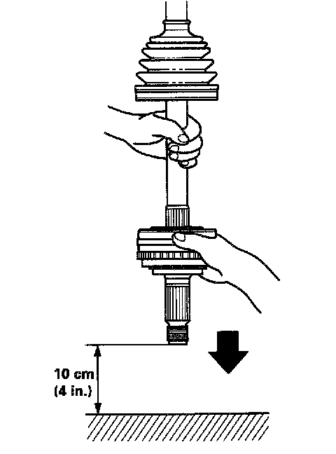5. To completely seat the outboard joint, pick up the driveshaft and joint, and drop them from about 10 cm (4 inch) onto a hard surface. Do not use a hammer as excessive force may damage the driveshaft.