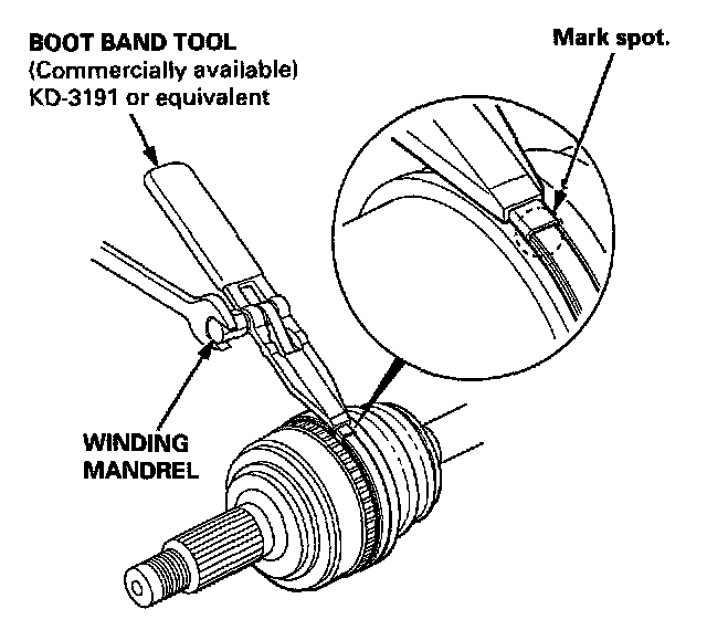12. Thread the free end of the band through the nose section of the commercially available boot band tool KD-3191 or equivalent, and into the slot on the winding mandrel.