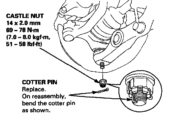 - Torque the castle nut to the lower torque specification, then tighten it only far enough to align the slot with the pin hole. Do not align the nut by loosening it. Install a new cotter pin.