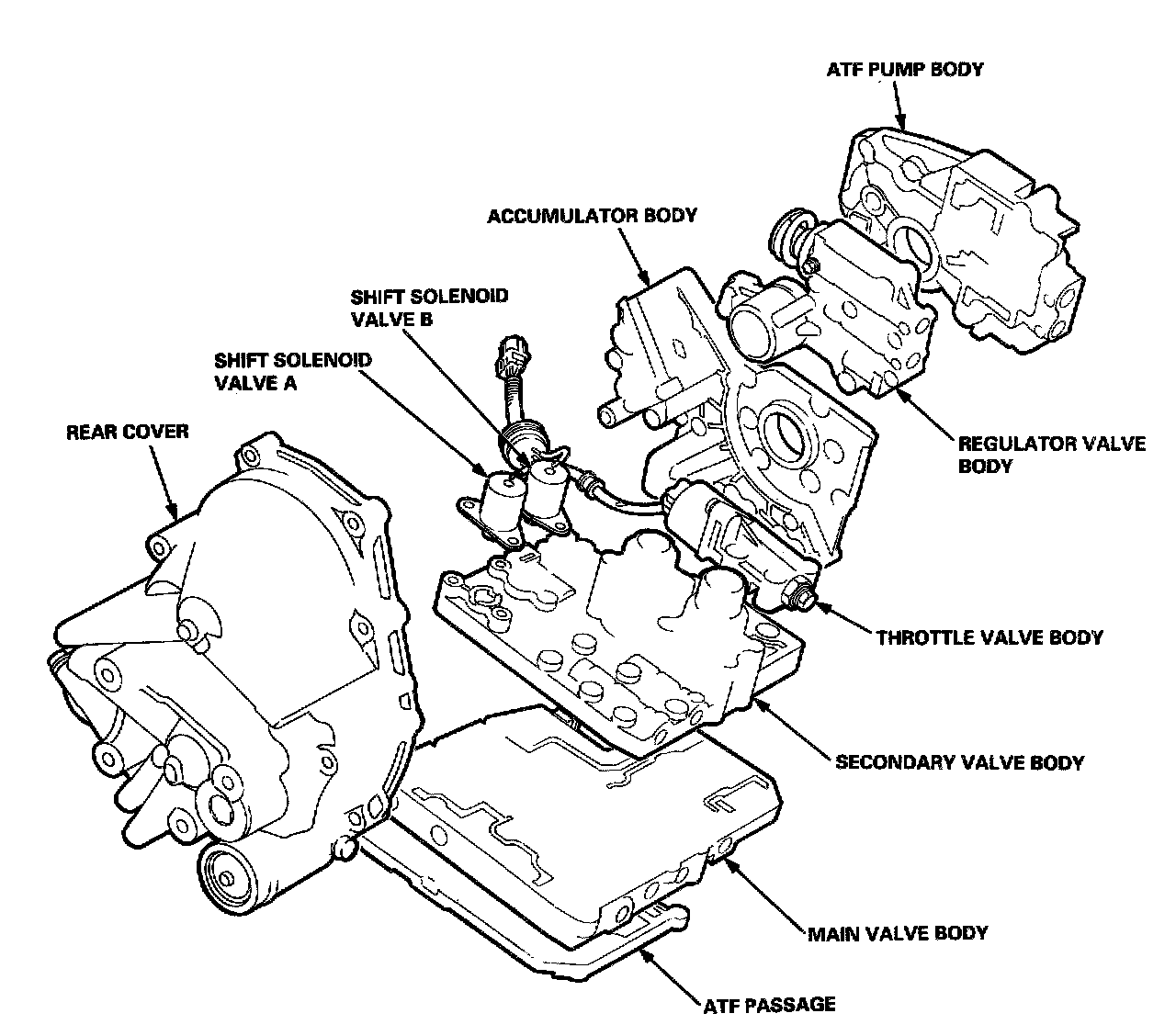 The lower valve body assembly is located on the bottom of the transmission housing. The lower valve body assembly consists of the main valve body, the secondary valve body and the ATF passage.