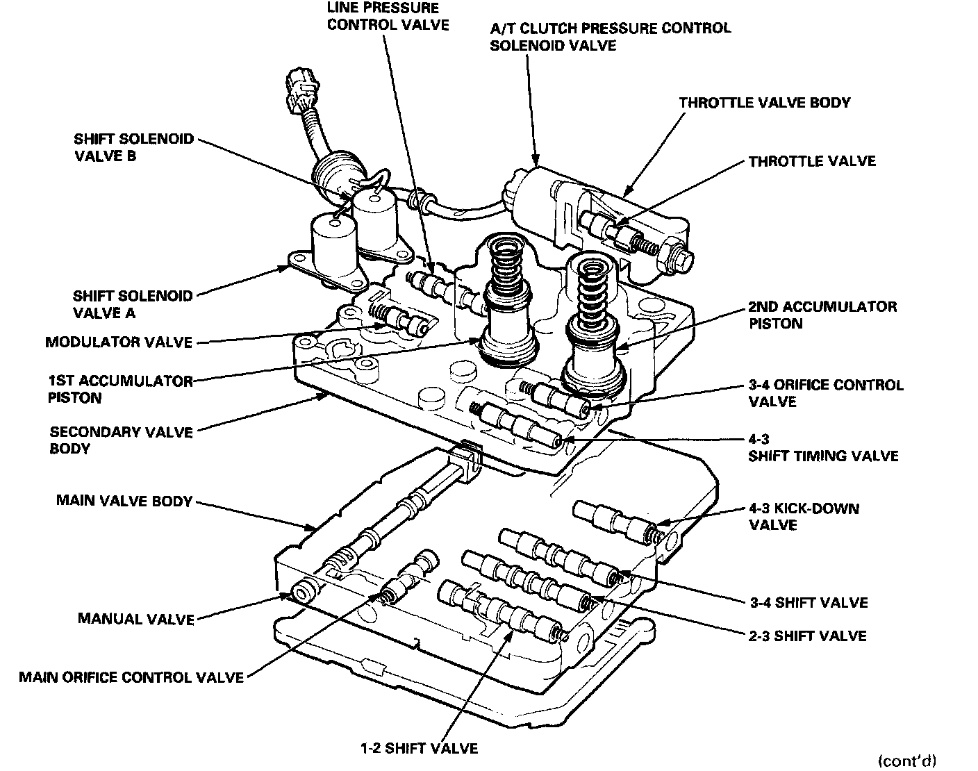The main valve body houses the manual valve, the 1-2 shift valve, the 2-3 shift valve, the 3-4 shift valve, the 4-3 kick-down valve and the main orifice control valve. The primary functions of the main valve body are to switch fluid pressure on and off and to control the hydraulic pressure going to the hydraulic control system.