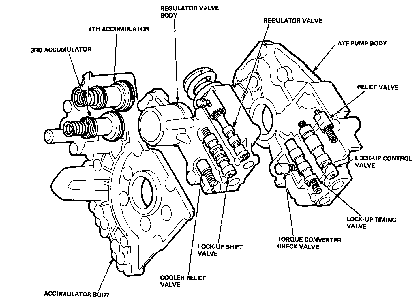 The ATF pump body is located on the torque converter housing. The ATF pump body consists of the ATF pump gears, the relief valve, the lock-up control valve, the lock-up timing valve and the torque converter check valve. The torque converter check valve is located between the ATF pump body and the torque converter housing.