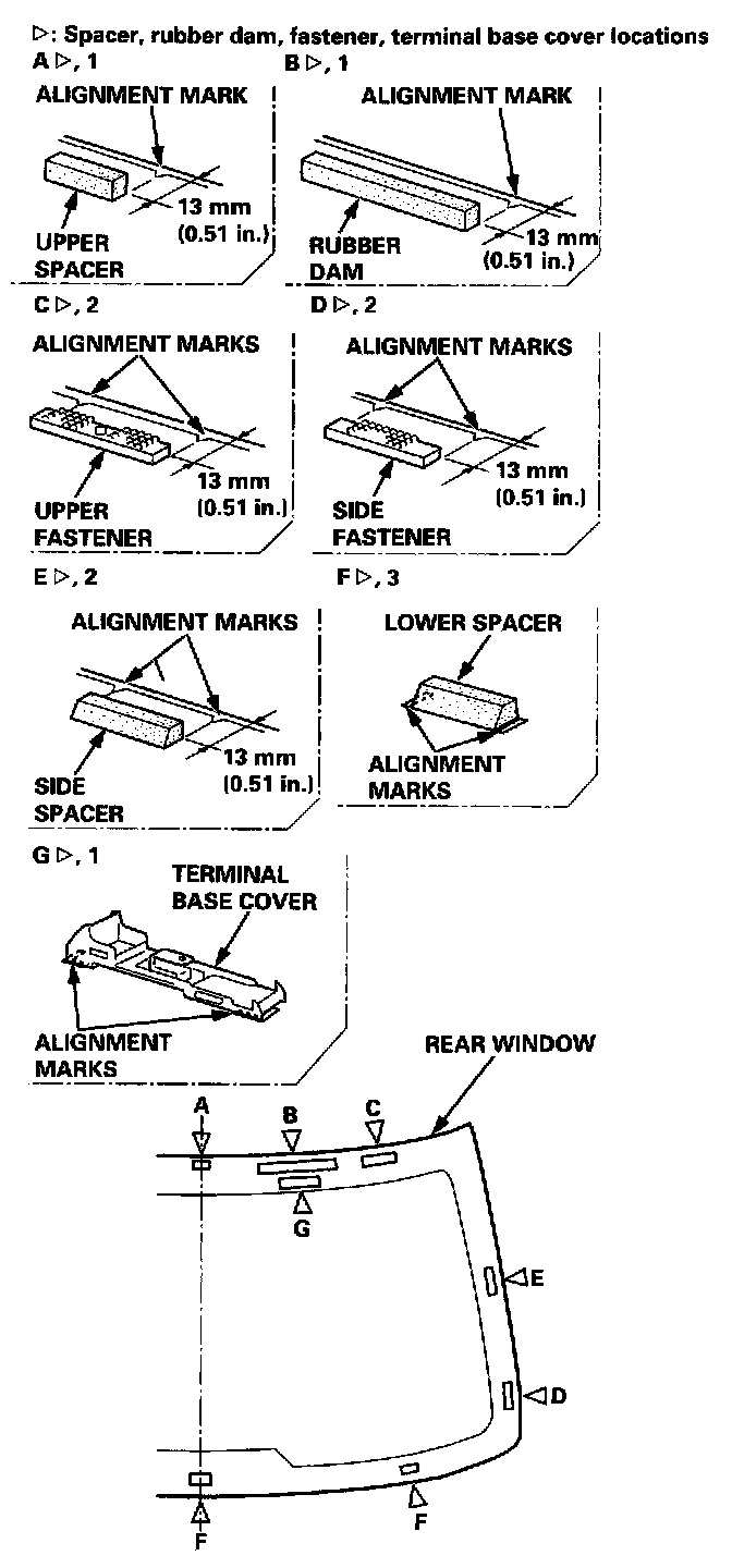 4. Glue the rubber dam, fasteners, and spacers to the inside face of the rear window as shown. If necessary, glue the terminal base cover to the rear window.