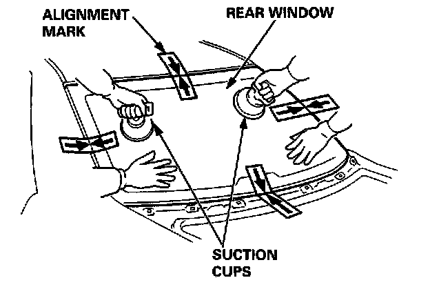 7. Set the rear window, then center it in the opening. Make alignment marks across the rear window and body with a grease pencil at the four points shown.