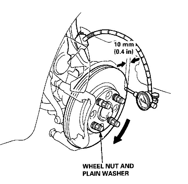 4. Use wheel nuts and suitable plain washers to hold the disc securely against the hub, then mount a dial indicator as shown, and measure the runout at 10 mm (0.4 in) from the outer edge of the disc.
