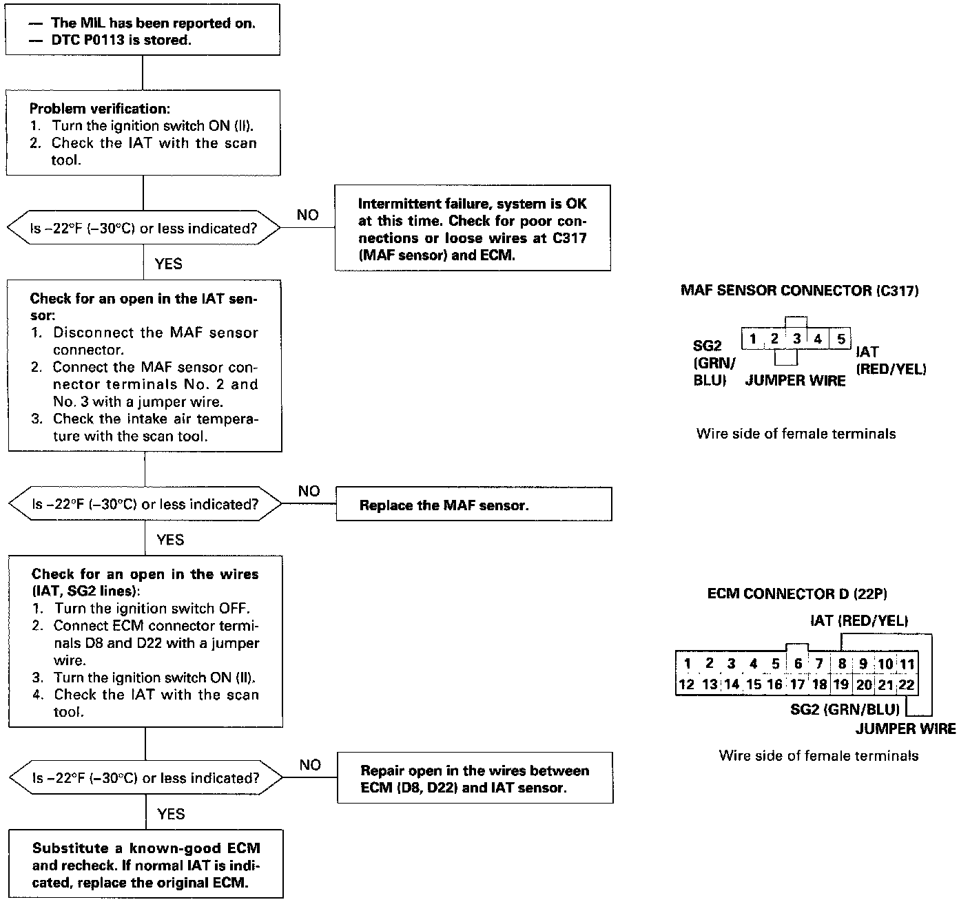 The scan tool indicates Diagnostic Trouble Code (DTC) P0113: A high voltage (low temperature) problem in the Intake Air Temperature (IAT) sensor circuit.