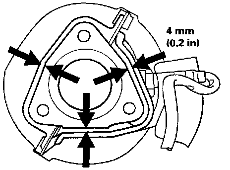 NOTE: Check that the clearance is more than 4 mm (0.2 inch) between the heat shields and rear side of the TWO as shown. If the clearance is less than 4 mm (0.2 inch), loosen the 6 x 1.0 mm bolts on the heat shields and tighten them adjusting the clearance.