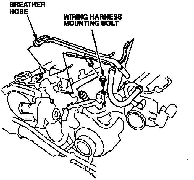 3. Remove the breather hose. Remove the wiring harness mounting bolt. Move the wiring harness out of the way.
