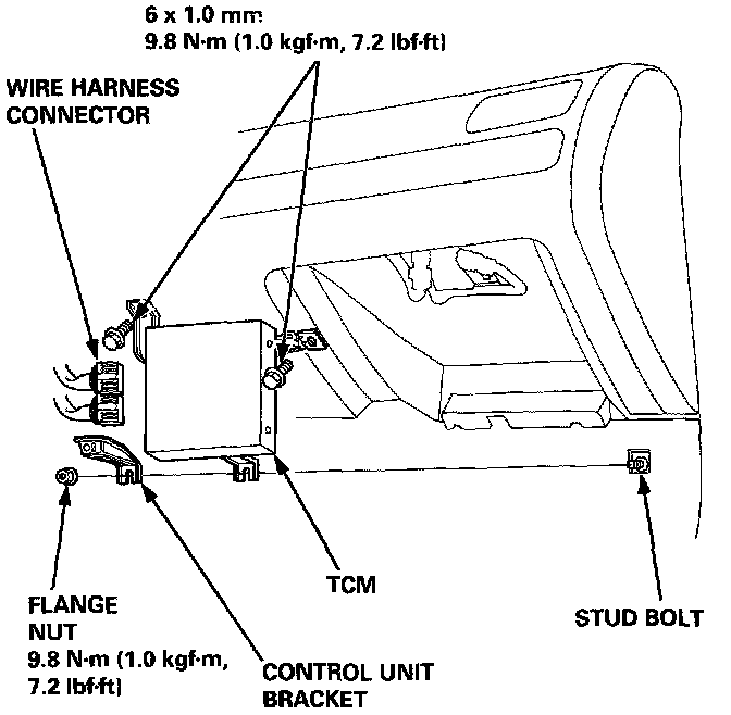 2. Remove the ABS control unit mounting bolts, and turn the ABS control unit over Disconnect the radiator fan timer control unit connector.