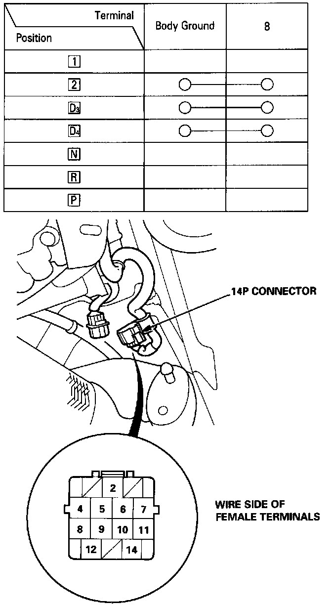 1. Disconnect the 14P connector from the A/T gear position switch.A/T Gear Position Switch Test: