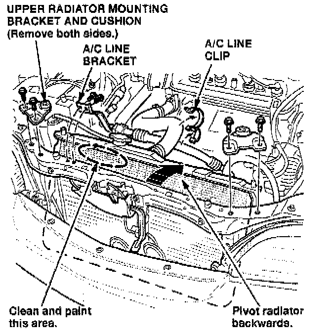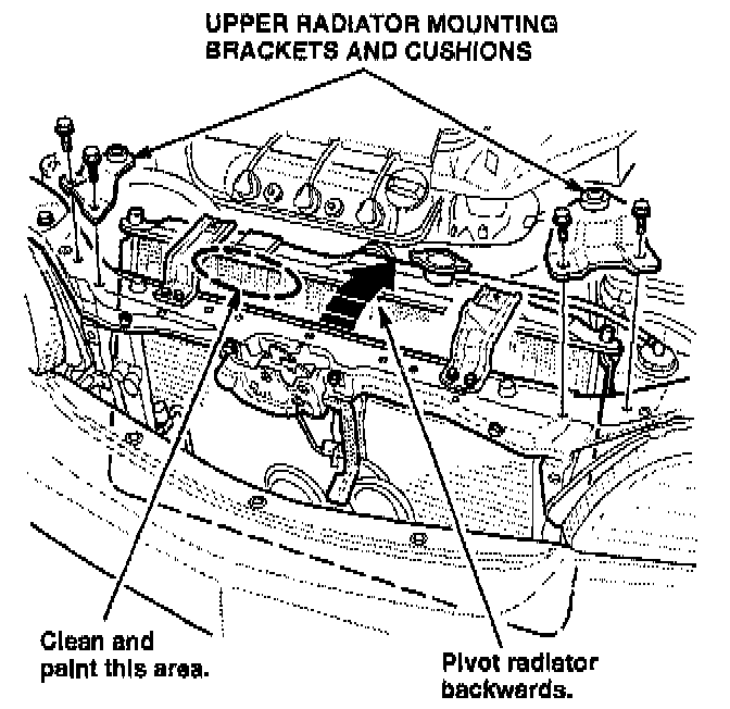 1. Remove the upper radiator mounting brackets and cushions.