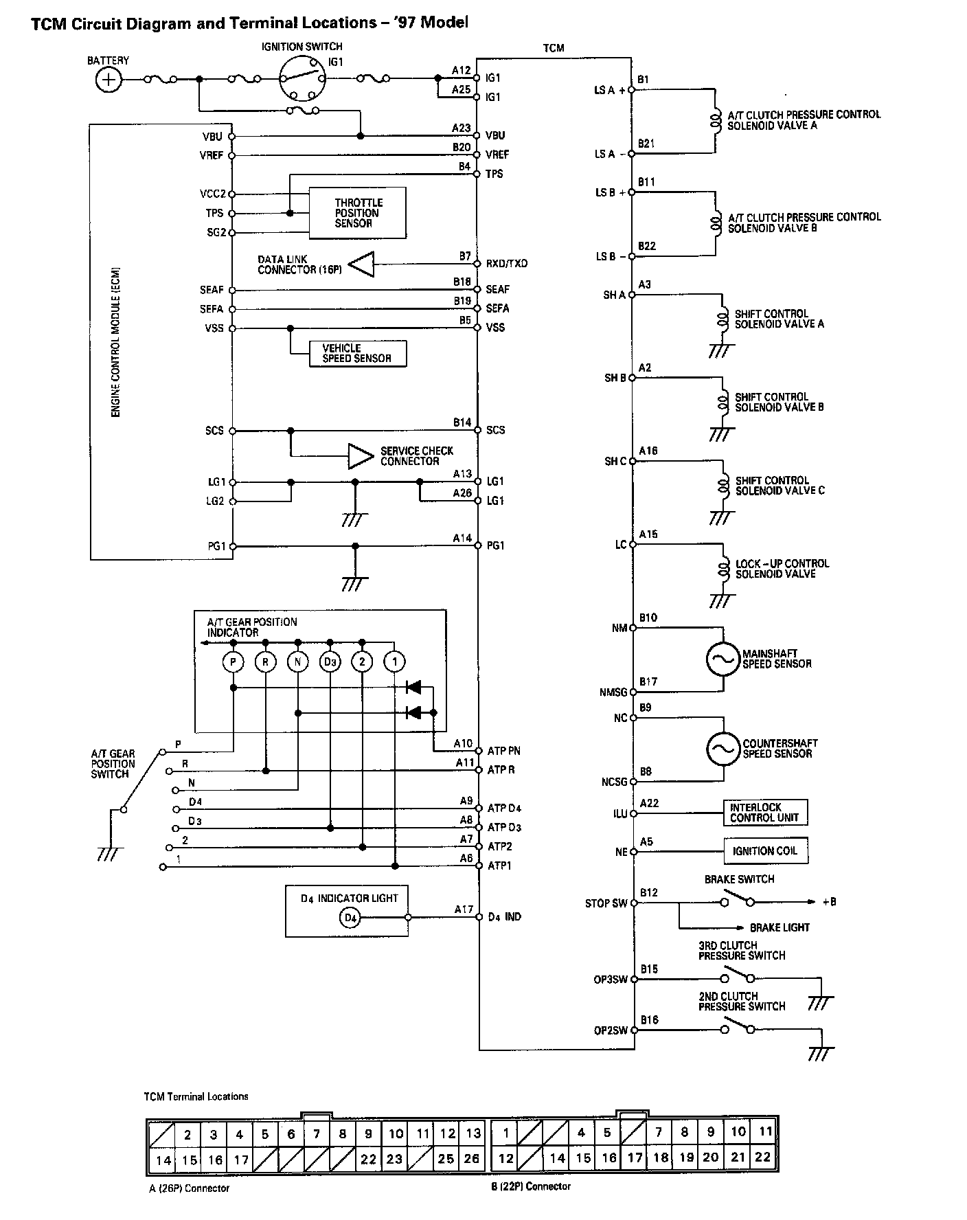 TRANSMISSION CONTROL MODULE (TCM) CIRCUIT DIAGRAM AND TERMINAL LOCATIONS