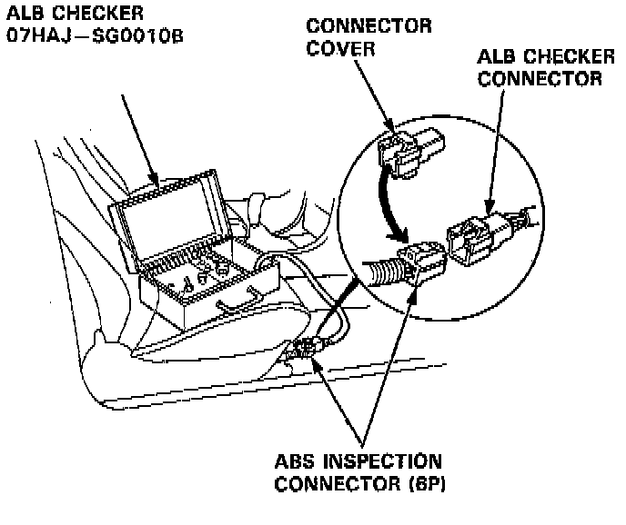 ALB Checker - With the ignition switch OFF, disconnect the Anti-lock Brake System (ABS) inspection connector (6P) from the connector cover located under the glove box, and connect it to the ALB checker. Continue with steps 5 through 11 of this procedure.