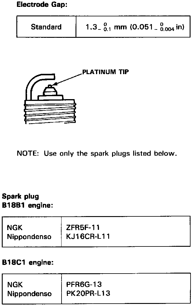 2. Do not adjust the gap of a platinum tip plug; replace the spark plug if the center electrode is rounded or if the gap is not within the specifications.