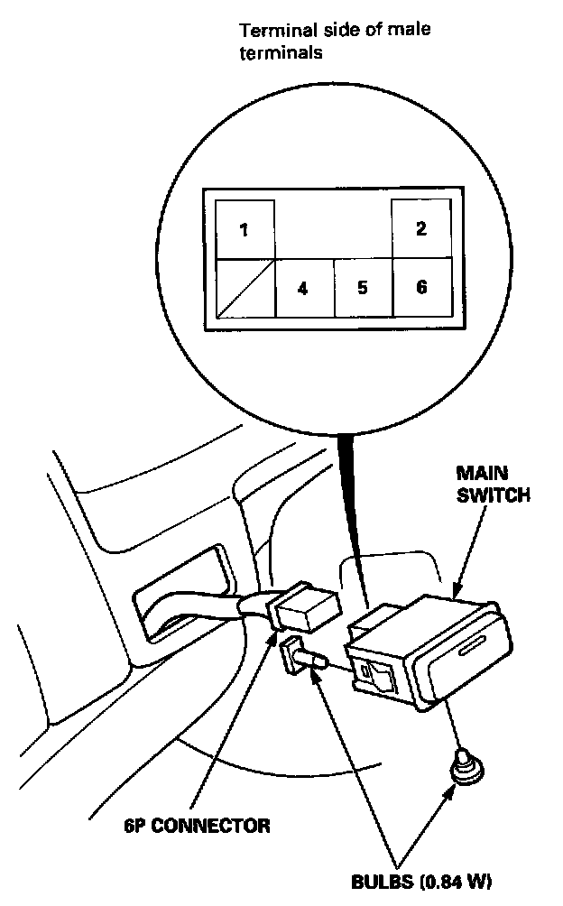 1. Carefully pry the switch out of the instrument panel.2. Disconnect the 6P connector from the switch.