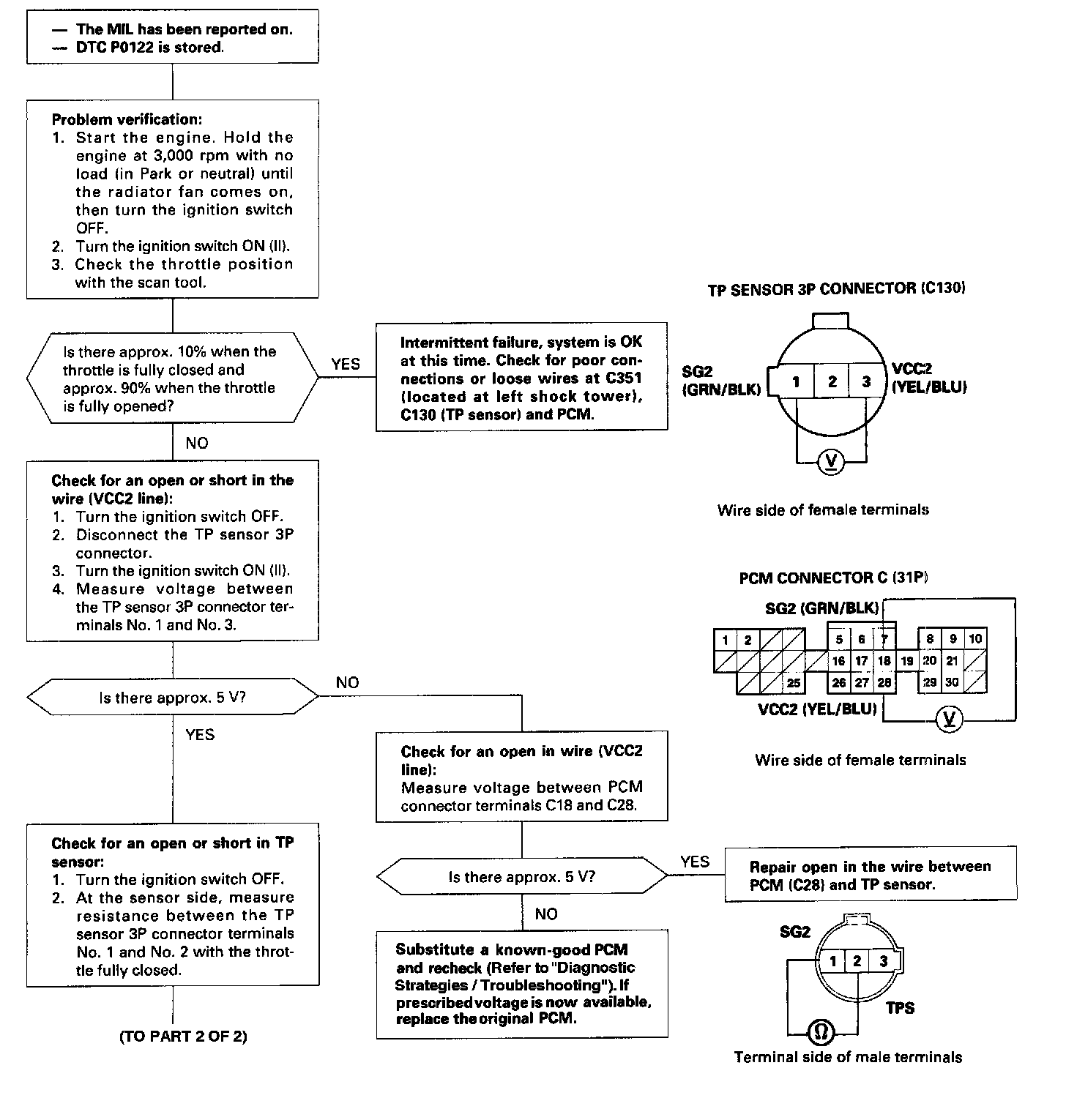 The TP Sensor is a potentiometer. It is connected to the throttle valve shaft. As the throttle position changes, the throttle position sensor varies the voltage signal to the ECM/PCM.