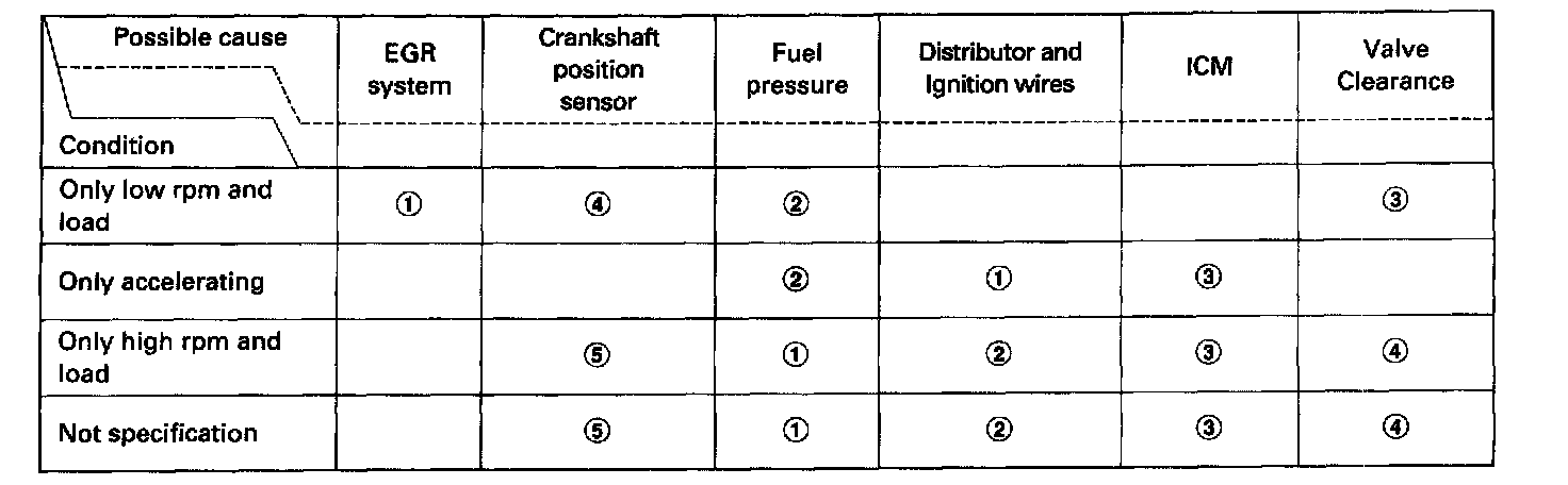 By test-driving, determine the conditions during which misfire occurs. Depending on these conditions, test in the order described in the table.