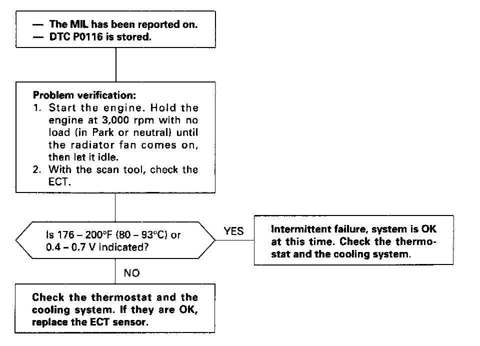 NOTE: If DTC P0117 and/or P0118 are stored at the same time as DTC P0116, troubleshoot those DTCs first, then troubleshoot DTC P0116.