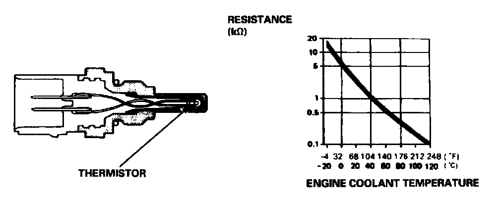 The ECT Sensor is a temperature dependant resistor (thermistor). The resistance of the thermistor decreases as the engine coolant temperature increases as shown above.