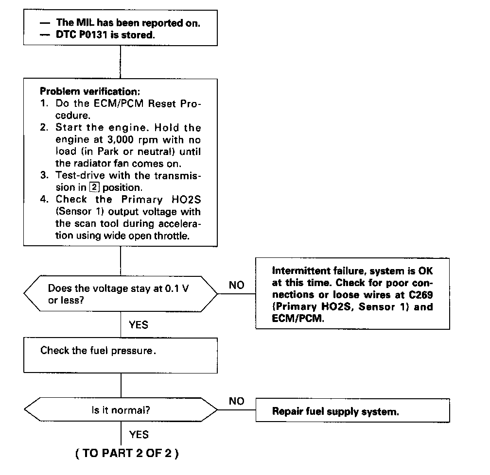The scan tool indicates Diagnostic Trouble Code (DTC) P0131: A low voltage problem in the Primary Heated Oxygen Sensor (HO2S) (Sensor 1) circuit.