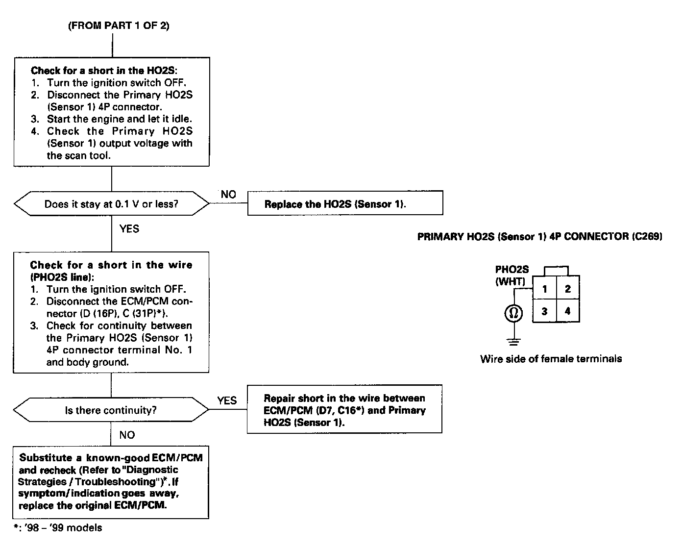The Heated Oxygen Sensors (HO2S) detect the oxygen content in the exhaust gas and signals the ECM/PCM. In operation, the ECM/PCM receives the signals from the sensor and varies the duration during which fuel is injected. To stabilize the sensor's output, the sensor has an internal heater. The Primary HO2S (Sensor 1) is installed in exhaust pipe A.