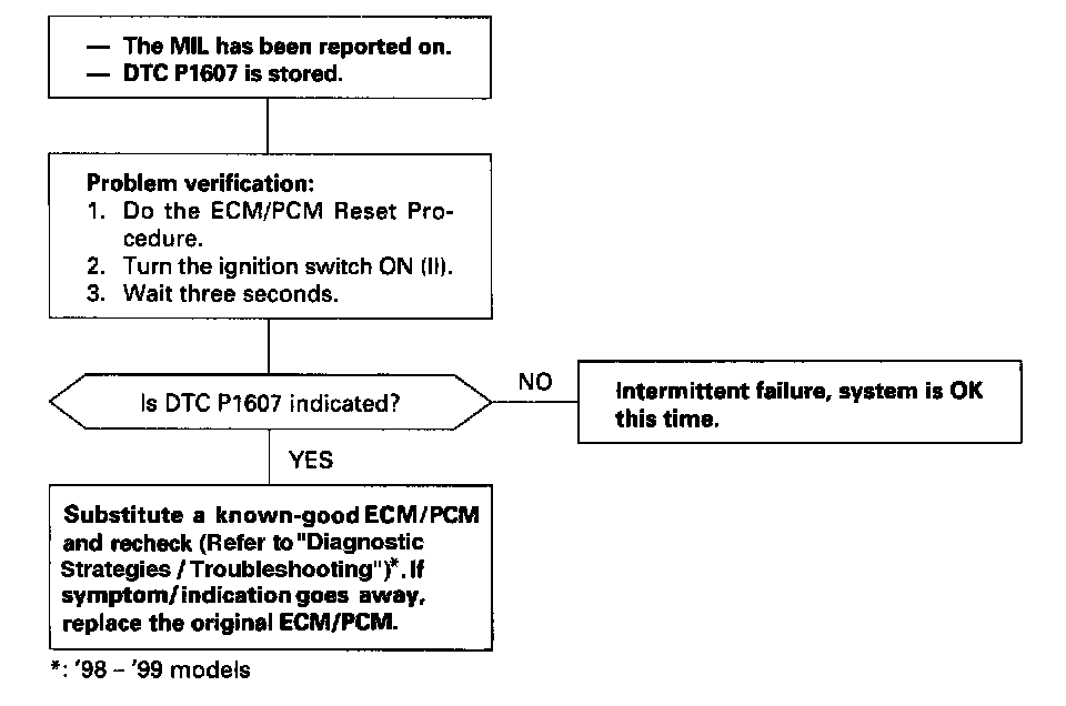 The scan tool indicates Diagnostic Trouble Code (DTC) P1607: An ECM/PCM Internal Circuit Problem.