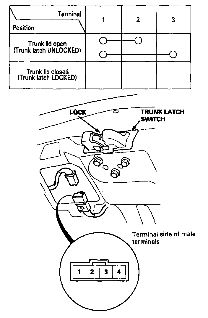 1. Open the trunk lid.2. Disconnect the 4P connector from the trunk latch switch.