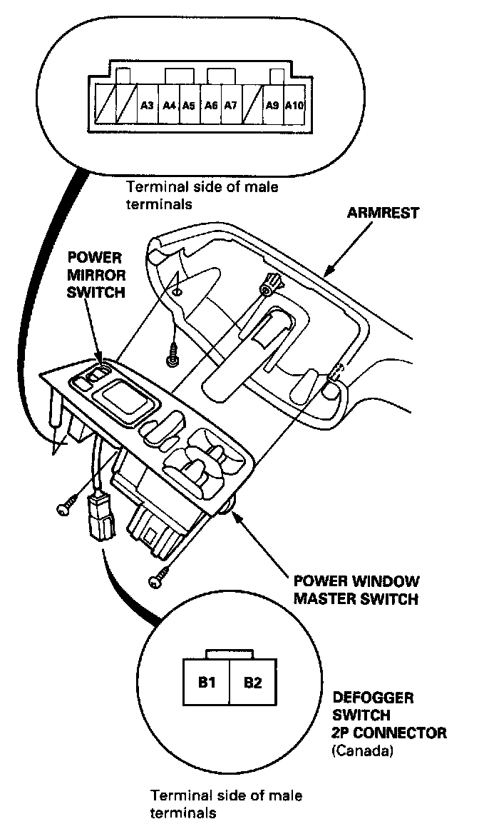 1. Remove the driver's door panel.2. Disconnect the 10P connector (and 2P connector: Canada) from the power mirror switch.