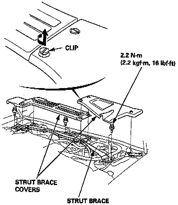 1. Remove the strut brace covers and the strut brace.