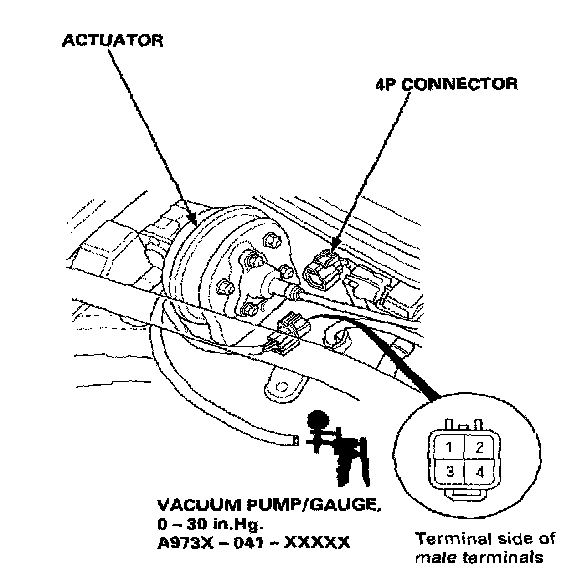 9. Disconnect power and ground from the 4P connector. Disconnect the vent hose from the actuator. Connect a vacuum pump to the actuator vent hose port, and apply vacuum. The actuator rod should pull in completely. If not, the vacuum valve is stuck open. Replace the actuator.