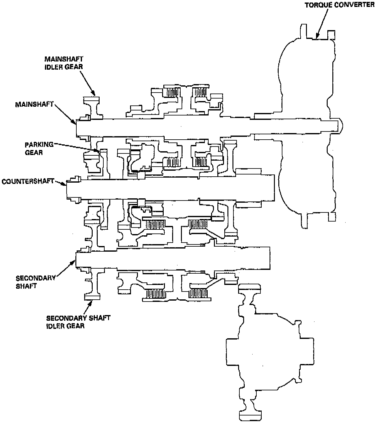 Hydraulic pressure is not applied to the clutches. Power is not transmitted to the countershaft. The countershaft is locked by the parking brake pawl interlocking the parking gear.