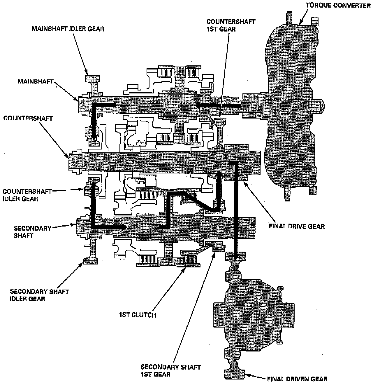 1. Hydraulic pressure is applied to the 1st clutch, then the 1st clutch engages the secondary shaft 1st gear with the secondary shaft.