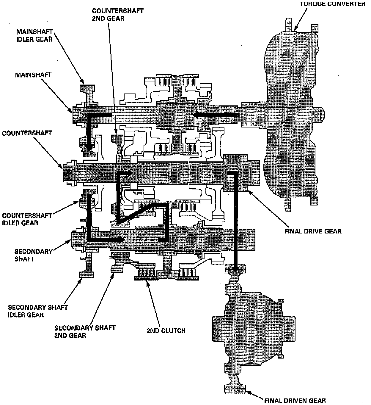 1. Hydraulic pressure is applied to the 2nd clutch, then the 2nd clutch engages the secondary shaft 2nd gear with the secondary shaft.