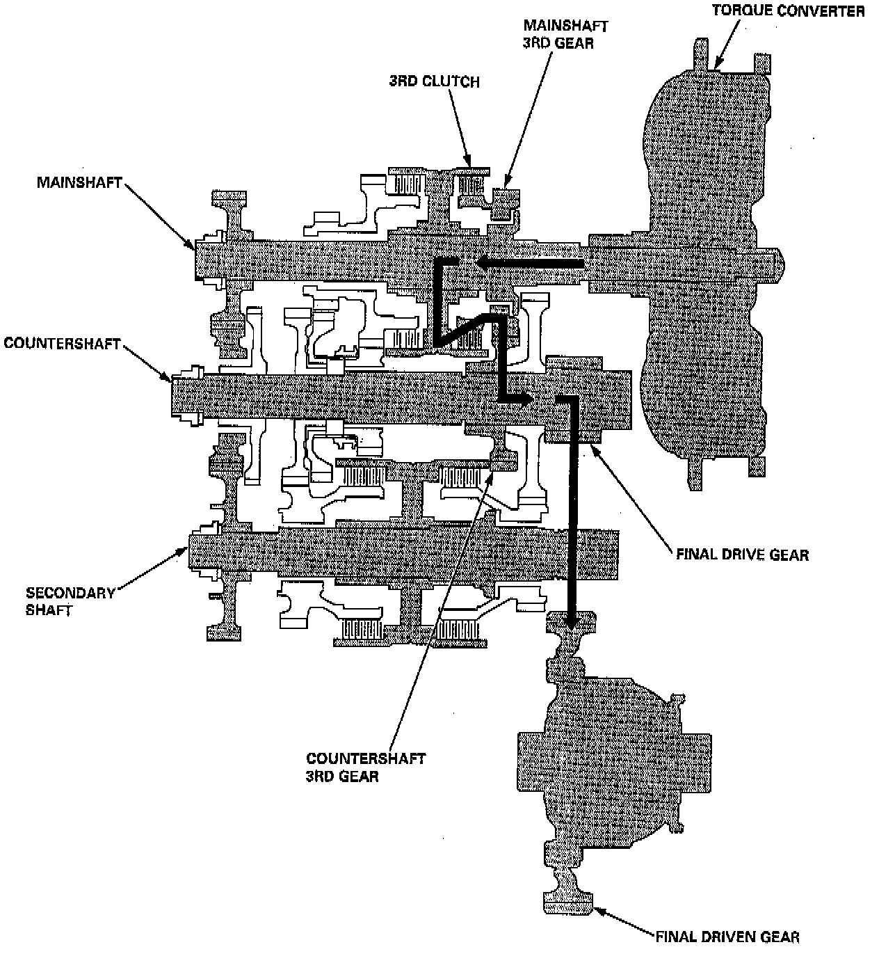 1. Hydraulic pressure is applied to the 3rd clutch, then the 3rd clutch engages the mainshaft 3rd gear with the mainshaft.
