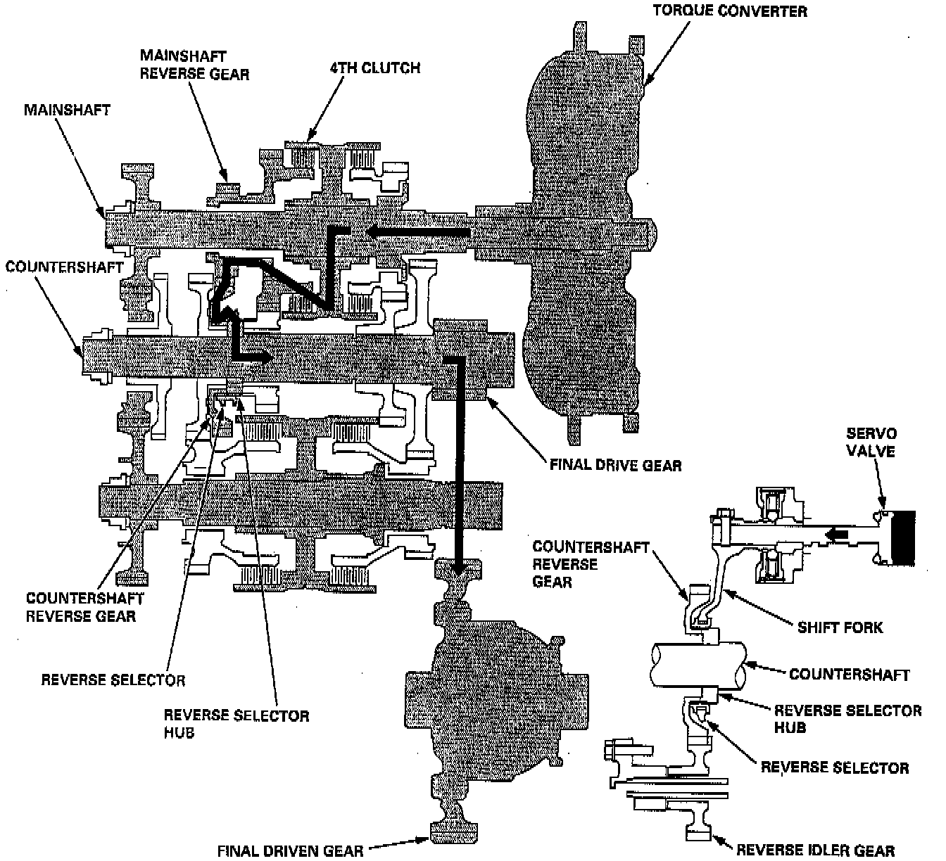 1. Hydraulic pressure is applied to the servo valve to engage the reverse selector with the countershaft 4th gear while the shift lever is in the forward range (D4, D3, 2, and 1 position).