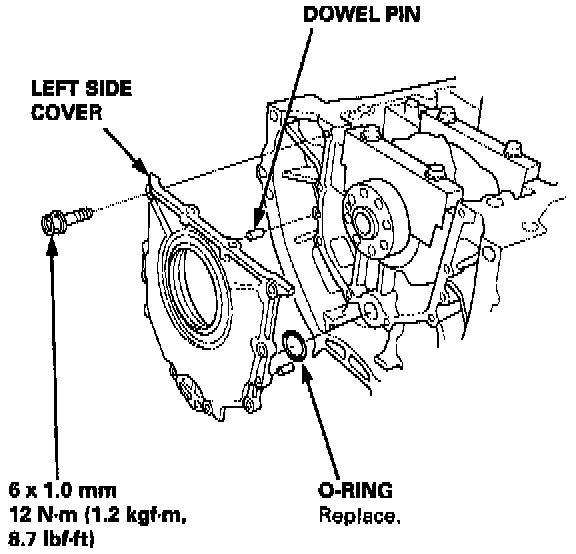13. Apply liquid gasket to the cylinder block mating surface of the left side cover, then install the cover on the cylinder block.