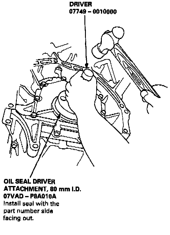 2. Measure the flywheel-end seal thickness and the oil seal housing depth. Using the special tool, drive the flywheel-end seal into the left side cover until the driver bottoms against the cover.
