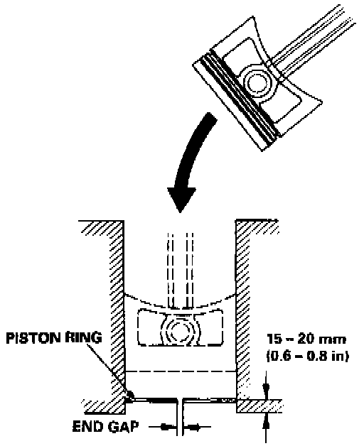 END GAP1. Using a piston, push a new ring into the cylinder bore 15-20 mm (0.6-0.8 in) from the bottom.