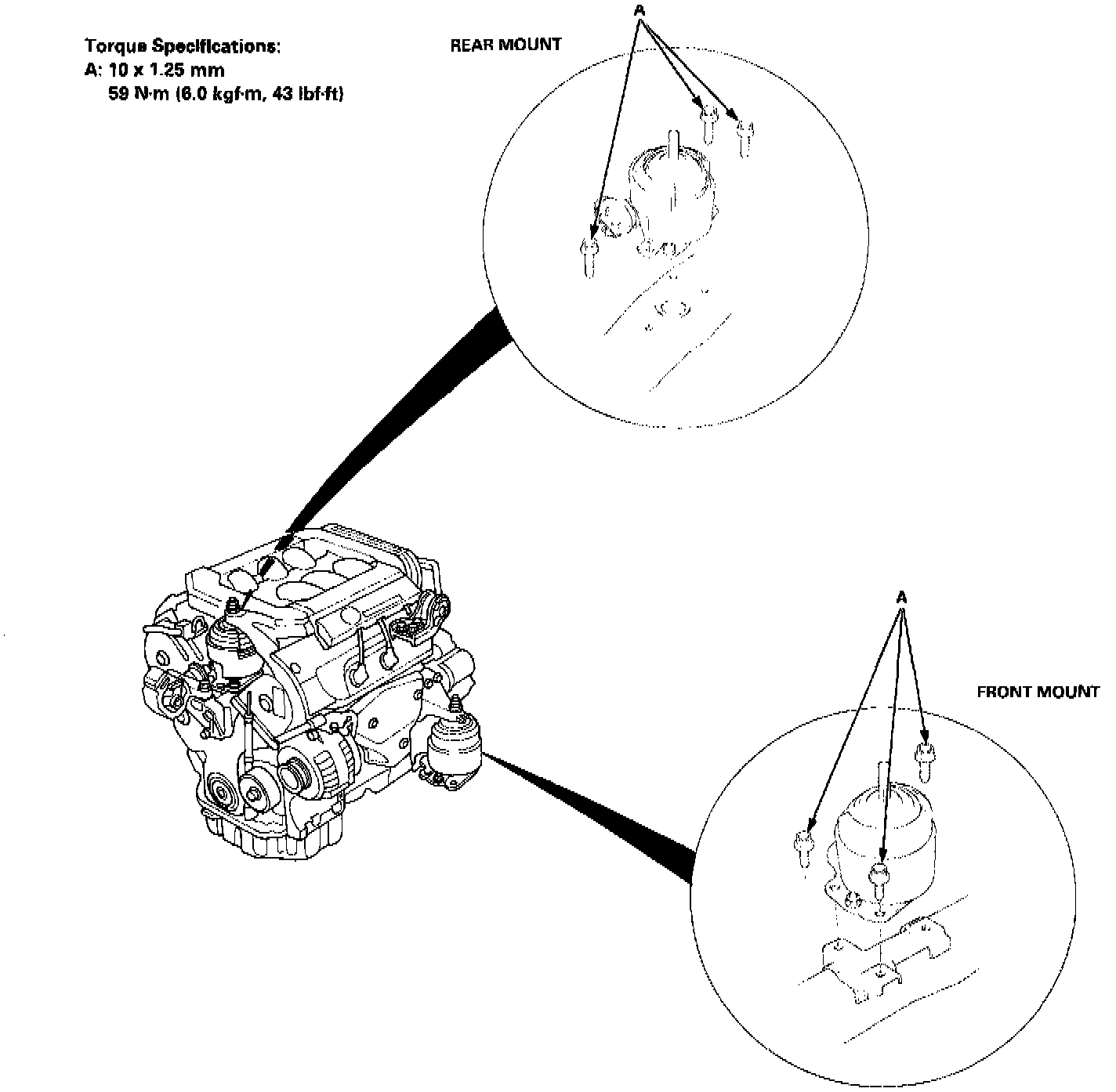 Install the engine in the reverse order of removal. Reinstall the mount bolts/nuts in the following sequence. Failure to follow these procedures may cause excessive noise and vibration, and reduce bushing life.