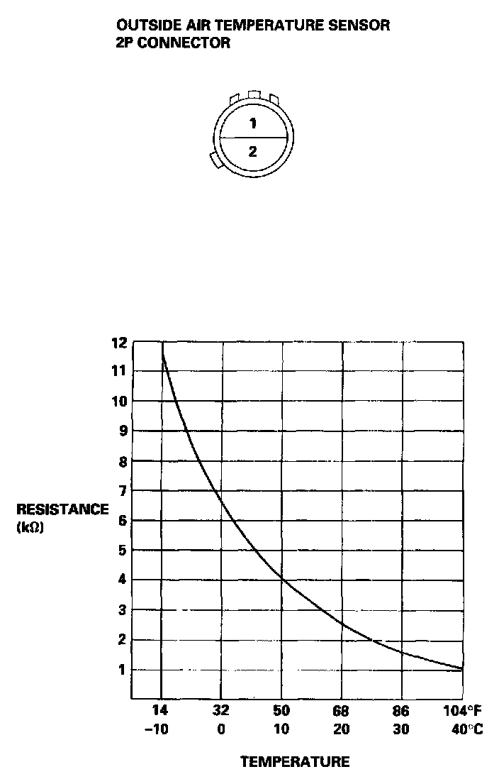 Compare the resistance reading between the No. 1 and No. 2 terminals of the outside air temperature sensor with the specifications shown in following graph; resistance should be within specifications.