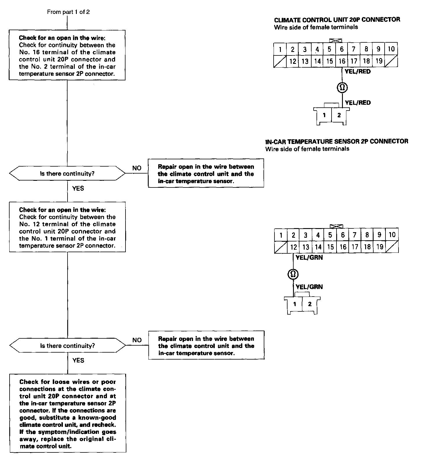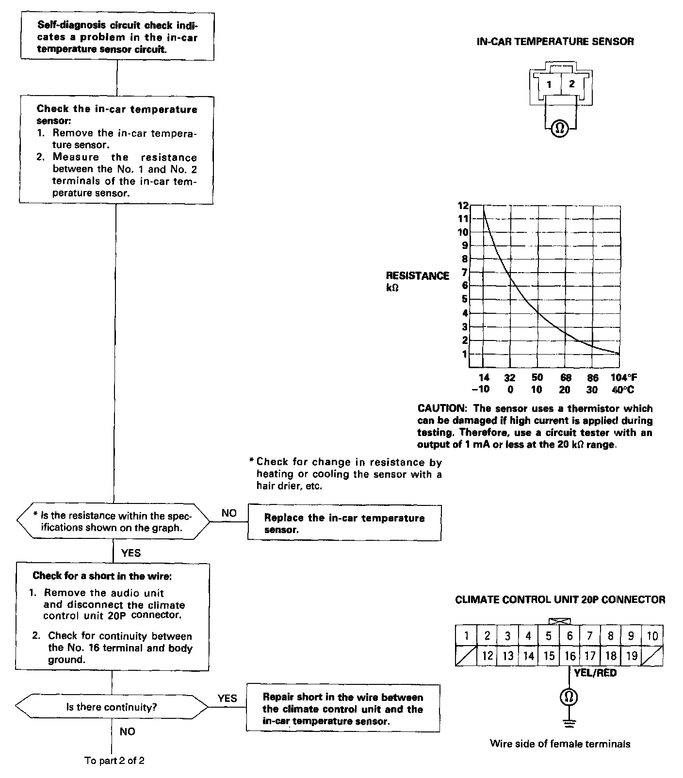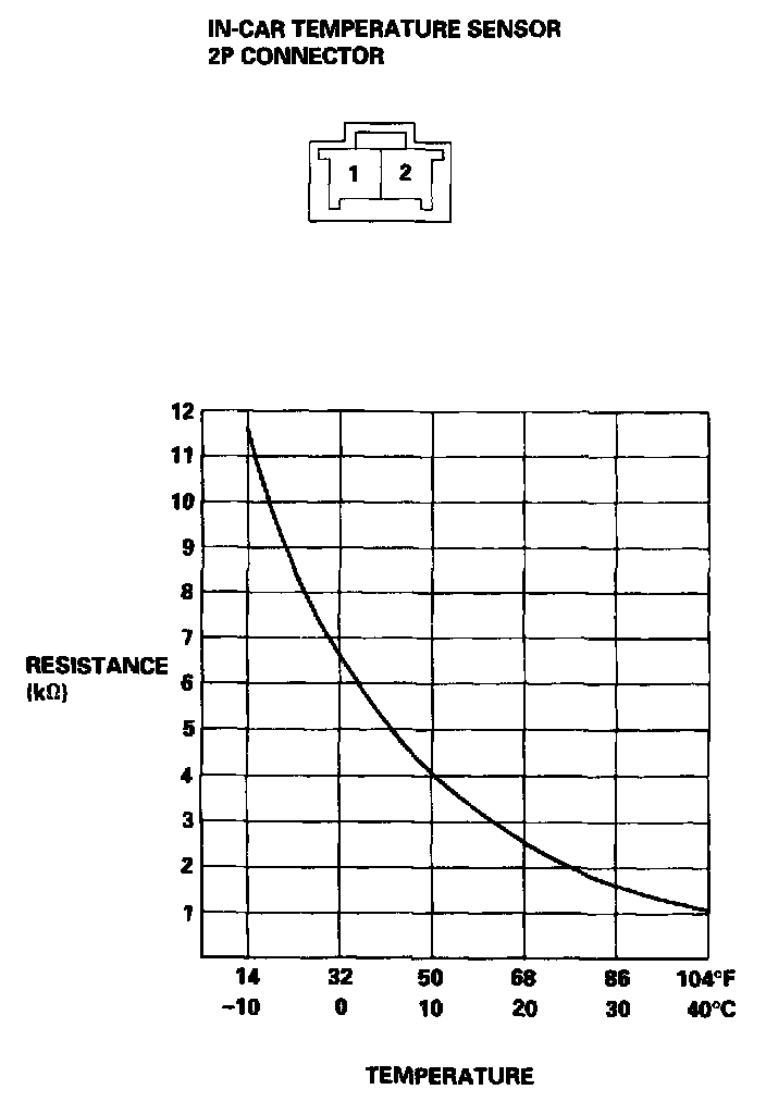 Compare the resistance reading between the No. 1 and No. 2 terminals of the in-car temperature sensor with the specifications shown in following graph; resistance should be within specifications.