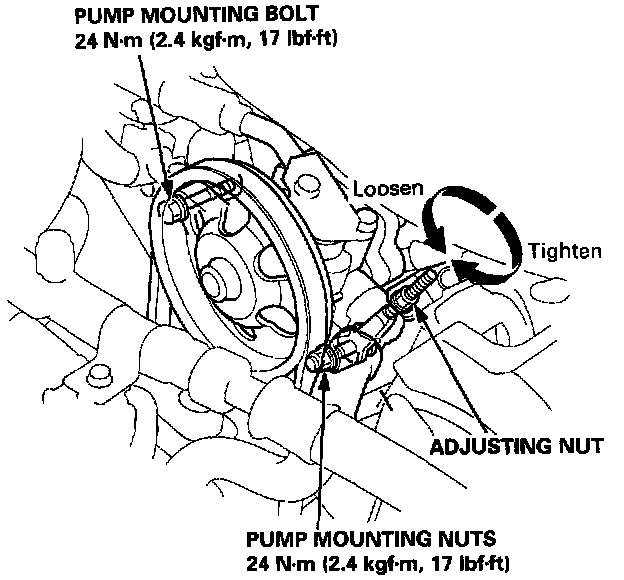 1. Loosen the power steering pump mounting nut and bolt.