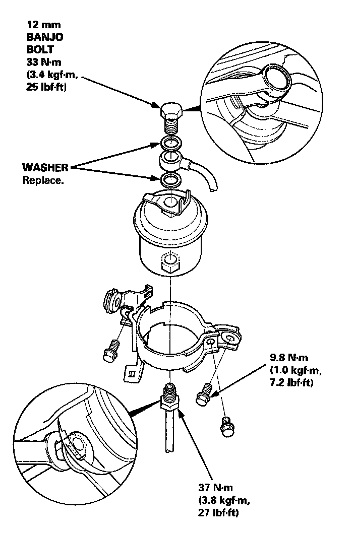 The fuel filter should be replaced whenever the fuel pressure drops below the specified value [280 - 330 kPa, 2.9 - 3.4 kg/sq.cm, 41 - 48 psi with the fuel pressure regulator vacuum hose disconnected from the intake manifold and the intake manifold port capped] after making sure that the fuel pump and the fuel pressure regulator are OK.