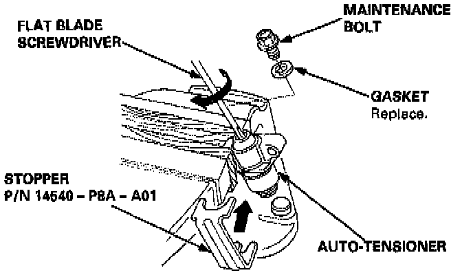 7. Insert a flat blade screwdriver into the maintenance hole. Place the stopper (P/N 14540-P8A-A01) on the auto-tensioner while turning the screwdriver clockwise to compress the bottom.