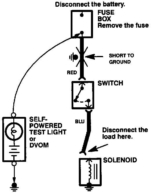 5. If the self-powered test light goes on or the DVOM displays a low reading or no reading (ZERO), there is a short to ground in the wiring near that point.
