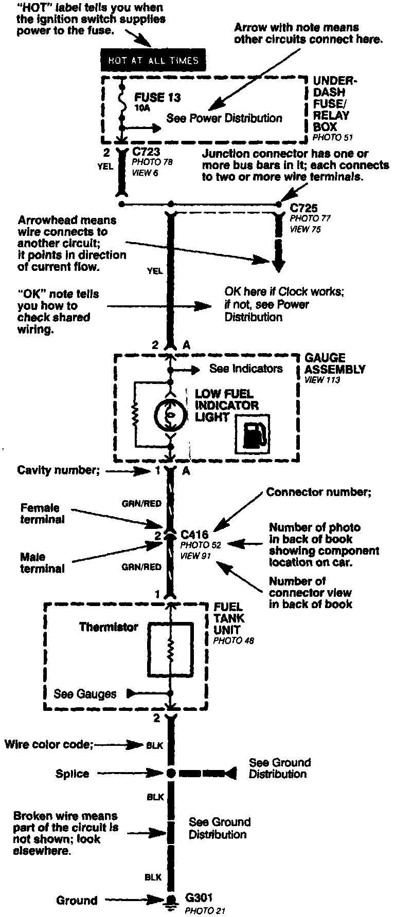 Other circuits may share power or ground terminals or wiring with the circuit shown. A wire that connects one circuit to another, for example, is cut short and has an arrowhead at the end of it pointing in the direction of current flow. Next to the arrowhead is the name of the circuit or component which shares that wiring. To quickly check shared wiring, check the operation of a component it serves. If that component works, you know the shared wiring is OK.